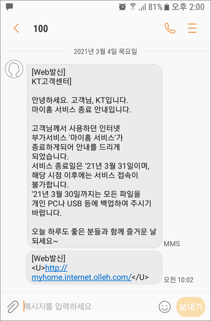 전화국 고객센터의 상담원이 해당 서비스 종료된다고 알려준다.