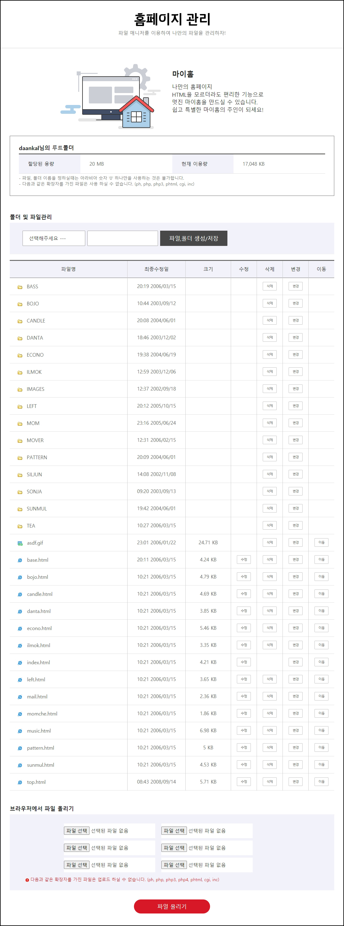 무려 20메가의 용량이다. 게시판과 방명록까지 넣을 수 있었다.